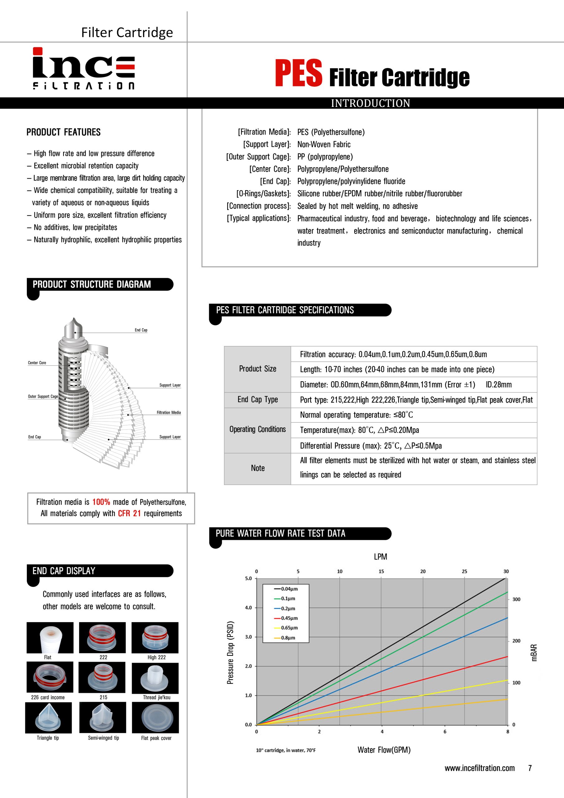 PES Series cartridge filter is constructed of imported hydrophilic asymmetric PES membrane and imported non=woven fabrics and silk