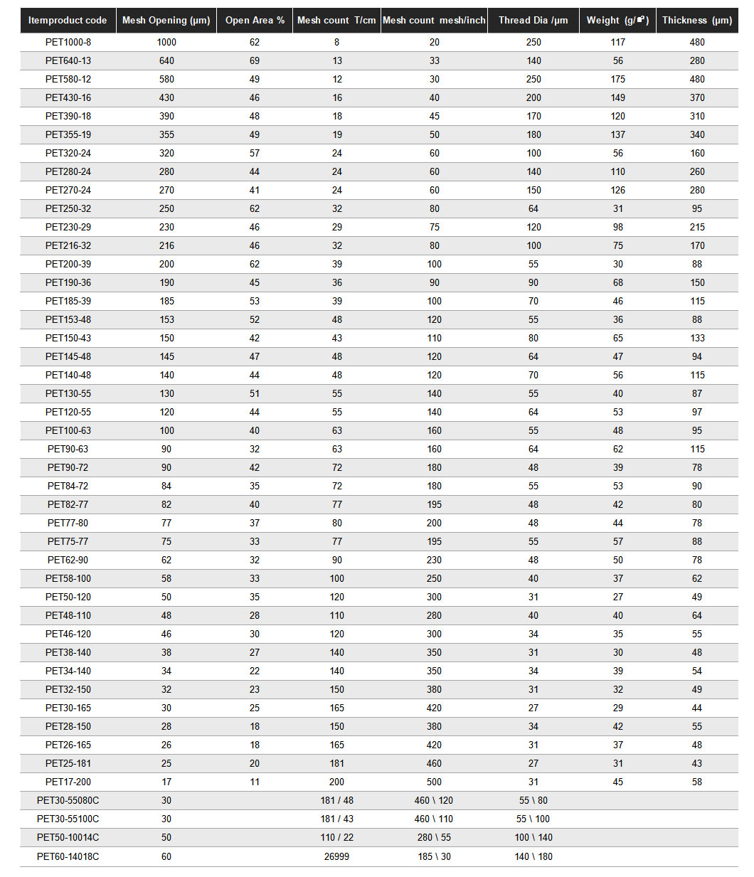 Mesh size: 8-200T (5 -500 mesh).