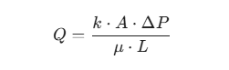 The flow velocity ($v$) through the filter media can be modeled using a modified version of Darcy’s Law: